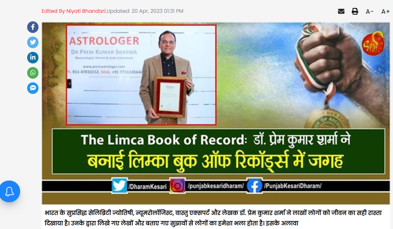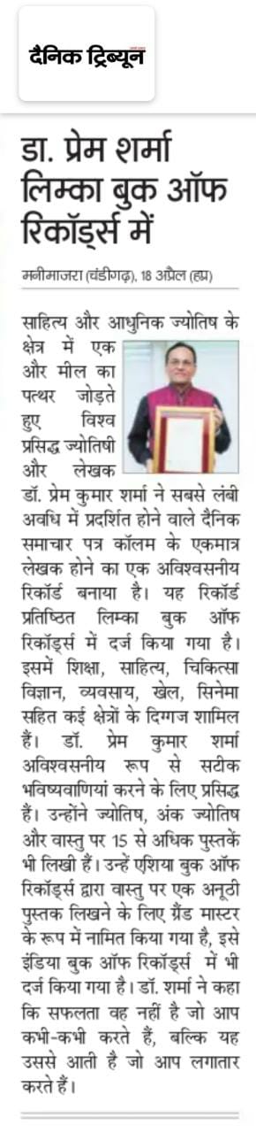 एस्ट्रोलॉजर डॉ प्रेम कुमार शर्मा ने बनाई लिम्का बुक ऑफ़ रिकार्ड्स में जगहhttps://epaper.punjabkesari.in/chandigarh/2023-04-21/chandigarh-kesari#pages/6 |